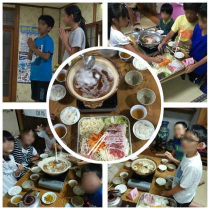 おふろが終わり、今日の夕食はかも鍋です!おいしそう〜!みんなお腹ぺこぺこです!いっぱい食べよう!