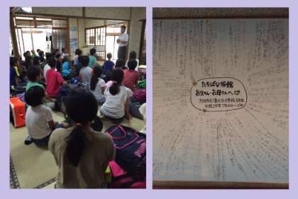 お世話になった宿舎「たちばな」のお父さんお母さんにみんなで寄せ書きをして感謝の気持ちを閉舎式で伝えました。たちばなのみなさま、また来年もよろしくお願いいたします。