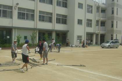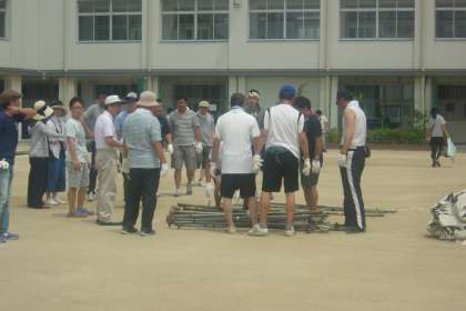 午後1時になると同時に、実行委員の方々を中心に、各町会や地域の方々とともに準備がスタートしました。ちょっと動くだけで汗がにじんでくるような暑さですが、「楽しい夜店にしよう」と頑張っているみなさんの熱い思いのほうが勝っているようです。