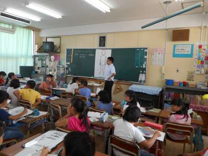 4年1組は理科で「ヒトの体のつくりと運動」の学習でした。人のどこに関節があるかを探して、関節の役割を考えました。リアルな模型があり、わかりやすかったです。