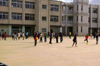 朝方の雨で、運動場に水たまりができていました。学校に登校してきた子どもたちは、残念そうに過ごしていました。休み時間のたびに、まだ乾かないかなと廊下の窓から運動場を眺めています。中には、先生に「赤い旗はまだとれませんか」と尋ねてくる子もいました。午前10時30分からの15分休みには、ほぼ水たまりが消えていましたので、運動場の赤い旗を片づけると、すぐに運動場には、多くの子どもたちがボールやなわとびを持って遊び始めました。