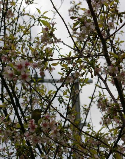 12月になり、寒い日が続いていますね。校内を歩いているといろいろな発見があります。南校舎のトイレ横に、12月なのになんと!『さくら』が咲いています。たぶん冬桜の一種で、毎年秋から冬にかけて咲いています。今日はその桜にメジロが蜜をついばみにきていました。もしよろしければ、冬の花見にお越しください。東側の道路からも見ることができますよ。