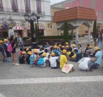 スペイン村での楽しい時間は終了しました。いっぱい遊んで満足そうです。今からすぐ近くのホテルへバスで移動します。