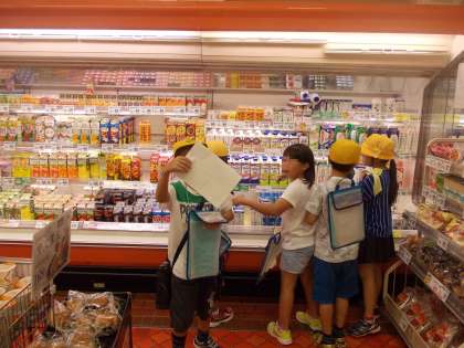 7日(金)に3年生が安立の商店街にある関西スーパーへ社会見学に行きました。教科書で学習した、はたらく人のようすを実際に確かめに行きました。「スーパーにはどんなものが売っているのか」「どのように品物を並べているのか」「はたらく人の工夫や苦労はどんなものがあるのか」などを実際に見て学習してきました。いつも行っているスーパーだけど、このような学習の視点で訪れてみると全く違ったように見えたことでしょう。