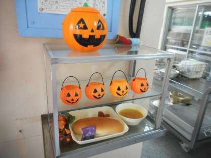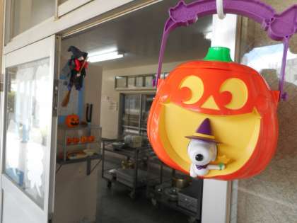 給食室の入り口付近がハロウィン仕様になっています。調理員さんたちがかわいい飾り付けをしてくれました。子どもたちも嬉しそうに見ていました!今月は本物のかぼちゃが給食によく出るので、子どもたちにはたくさん食べてほしいと思います。