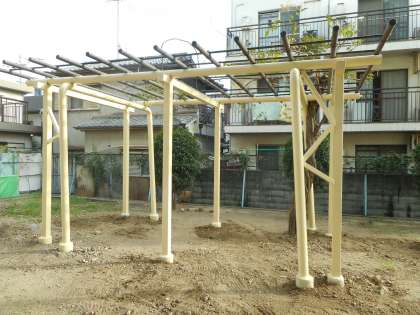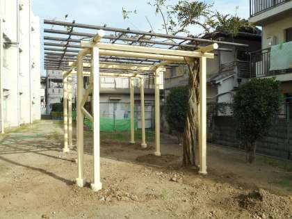 今週の火曜日から、トトロの森にある藤棚の補強工事を行っていました。