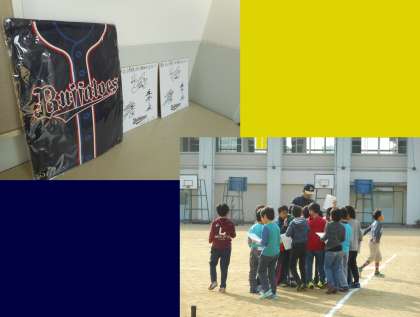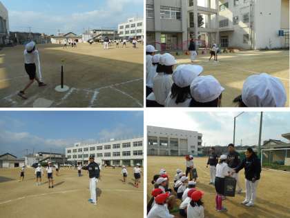 今日は、オリックス・バファローズの小学校訪問で、少年野球教室コーチの方々に3.4年生がティーボールを教えていただきました。ルールや打ち方など丁寧に教えていただき、日頃あまり野球と縁のない子どもたちもスムーズに活動することができました。元々プロで活躍されていた方々なので、教え方もとても分かりやすかったです。最後には一人一人にプレゼントまでいただき、子どもたちは大満足の様子でした。ぜひ、お家でもお話を聞いてあげてください。