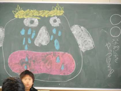 今日は節分です。2年生の教室から「おには〜そと!」と大きな声が聞こえてきました。黒板に描かれた鬼に何やら紙を投げています。よく見てみるとその紙には、「自分の中から退治したい鬼(こと)」が書かれてありました。