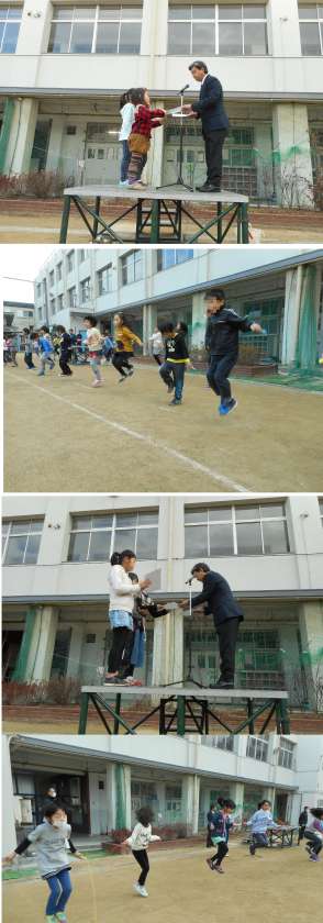 今日の児童朝会で、なわとび検定の1級に合格した児童に表彰がありました。また、自分の得意な技も披露し他の児童からは大きな拍手が湧きました。レベルの高い技もいくつかあり、努力の様子がよくわかりました。よく頑張りました。おめでとう!