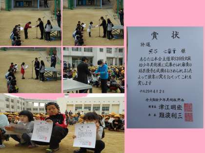 今日の児童朝会で、「幼少年美術展」に出展していた作品の表彰がありました。30人近くの児童が受賞しました。他の児童も一生懸命頑張りましたが、特に受賞したみなさんおめでとうございます!!中には『特選』もありました!!