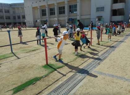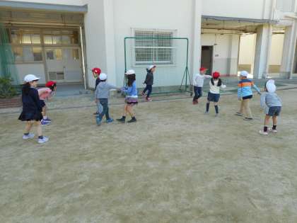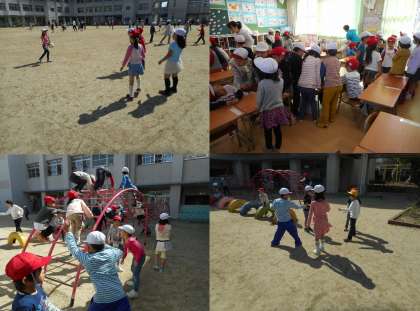 今日の1時間目、1年生と2年生が交流会を行いました。2年生が中心になって教室でグループを決めて活動内容を話し合い、運動場で活動しました。2年生の子どもたちはすっかりお姉さん・お兄さんでした。