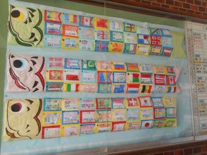 今月の玄関掲示は5年生の作品を飾っています。うろこの部分を世界の国旗でデザインしたこいのぼりを制作し、うろこにはそれぞれの国の首都なども書かれています。来校された際には、ぜひご覧ください。