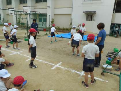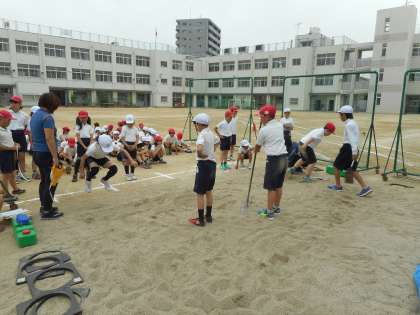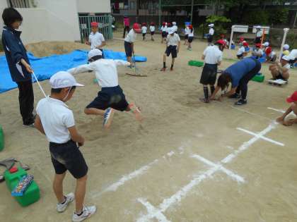 昨年度、運動場の砂場を改修してむかえる初めての立ち幅跳び。今日、4年生は50m走に引き続き立ち幅跳びも行いました。後ろに倒れてしまい、悔しがっている子どももいました。