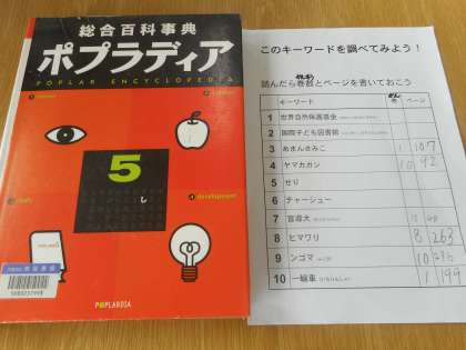 今日、3年生は住吉区より図書司書の方にお越しいただき出前授業を受けました。ポプラディアという総合百科事典を活用し、事典のひき方を学習しました。カタカナの場合など、くわしく話をしていただき、実際に事典で調べ学習を行い体験的に学習しました。