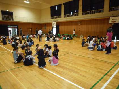 今日は最後の1年生との交流会で、5年生が行いました。歌の交換や特別支援学級の子どもの紹介をした後、「ボール送りゲーム」をしました。グループを作って円になり、自己紹介をした後ゲームを楽しみました。