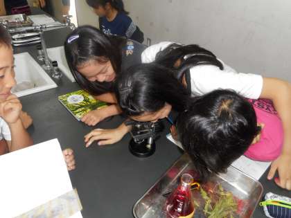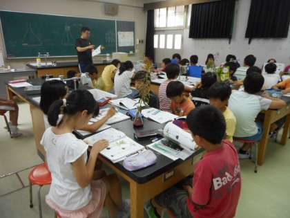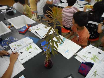 今日、6年生は植物の水の通り道を調べる実験をしました。染色液を吸い上げた植物はどうなっているのか観察し、実際に茎を切って様子を調べました。