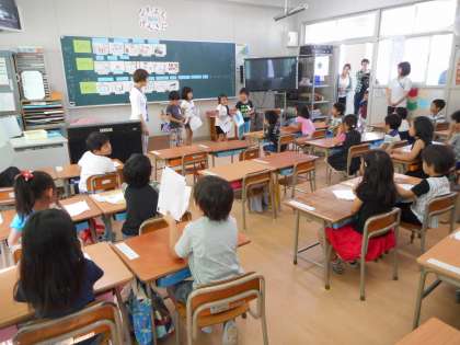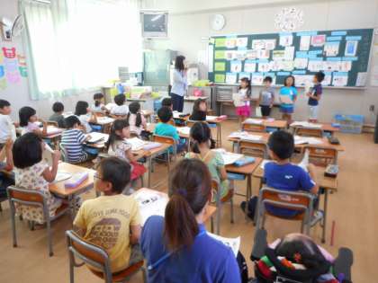 1年生は学習参観で「がっこうだいすき」と題して、がっこうたんけんで見た特別教室を発表しました。入学して2か月が経ち、学校生活にも慣れてきたように思います。