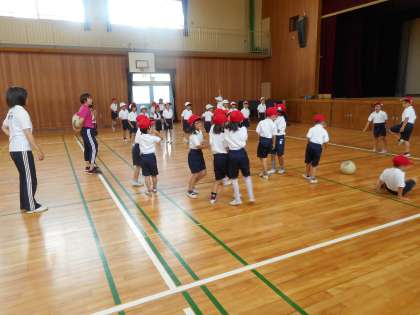 今日は朝から雨が降り、水温も低かったため水泳は中止でした。1年生はプールがなかった変わりに、講堂でボール運動を行って体を動かしました。