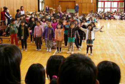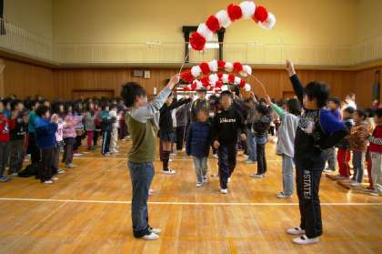 1年生と手をつないで、花のアーチをくぐり入場してきました。(写真1)