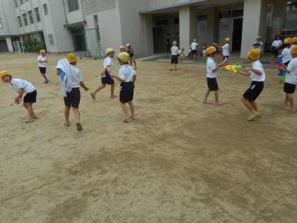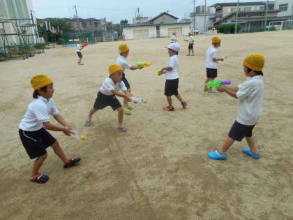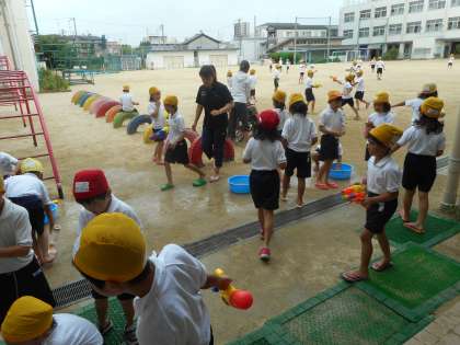 今日、1年生は夏遊びを行いました。水曜日は天気が悪くできなかったのですが、本日はプールに入る前に行えました。水で遊ぶ楽しさは、暑い時期ならではですね。