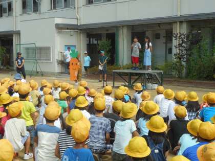 今週はあいさつ週間です。今朝も元気なあいさつの声が聞こえてきました。今日の児童朝会では、先日募集したデザインの中から選ばれたあいさつ週間のマスコットキャラクターの紹介がありました。