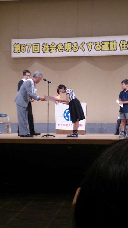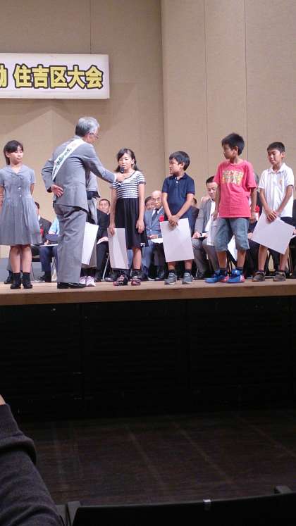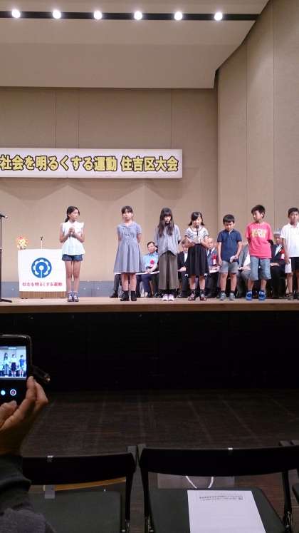本日の午後2時より、住吉区民センターの大ホールで、「第67回社会を明るくする運動」住吉区大会が行われました。その第1部の式典で、住吉区の小学生が作った標語の表彰式がありました。