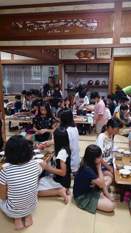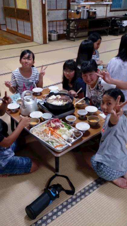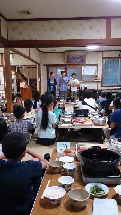 夕食のあとは「キャンプファイヤー」、明日は「飯ごう炊さん」「魚つかみ」などの行事があります。明日もHPで様子をお伝えしますので、お楽しみに!!!