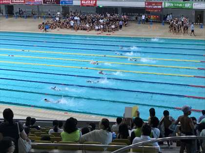 今日は門真市のなみはやドームで大阪市児童水泳記録大会が行われています。今年度は昨年度より内容が大きく変わり、新しい大会となっています。4年生以上の参加している子どもたちが自由形や平泳ぎでがんばりました。