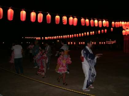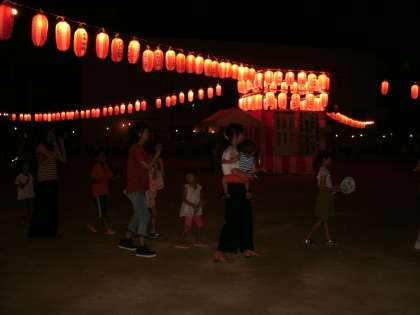 子どもたちも大人の方もたくさん集まって来られ、踊りの輪に加わってくれています。みんな楽しそうに踊っていて、とってもさわやかな気分です。子どもたちの時間が終わっても午後10時まで続きますので、どんどんご参加ください!!