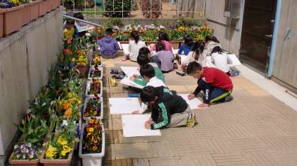 4年生が、春の花を描いている様子を見かけました。少し肌寒かったのですが、集中して描いていました。