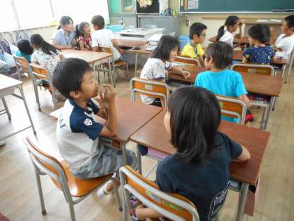 3年生は学級ごとに外国語と国語科の学習を行いました。外国語では気分を英語で聞きあったり、好きな果物や夢を英語で発表するなど、英語に慣れ親しみました。