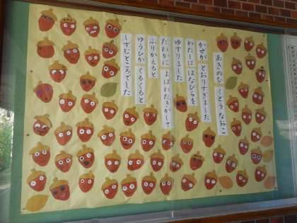 今月の玄関掲示は1年生の作品です。かわいいどんぐりがたくさん笑っています。最近、急に寒くなり体調を崩す子どもたちもいるようです。来校された際には、ぜひご覧ください。