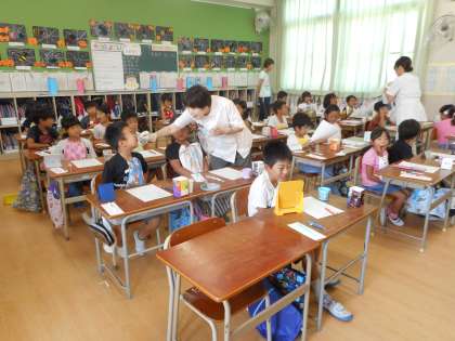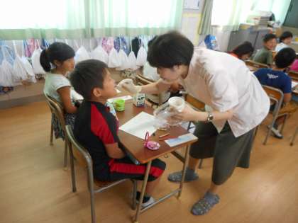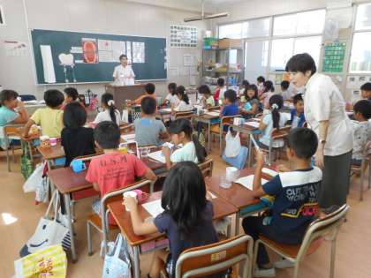 今日2年生は、歯科衛生士さんにお越しいただき歯みがきの指導を受けました。歯垢について学習し、薬を使って実際に歯みがきの仕方を学びました。