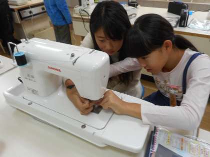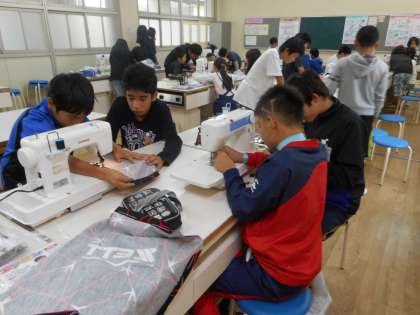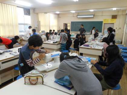 6年生はミシンを使って、エプロン作りをしています。糸が絡まった時は大変ですけど、完成に向けて頑張っています。仕上がったエプロンを着ての調理実習が楽しみです。