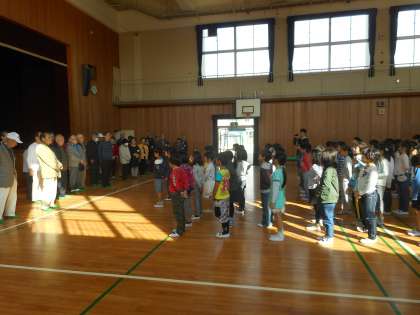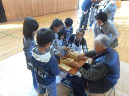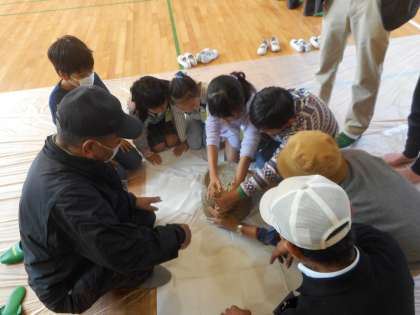 今日、3年生は「昔にタイムスリップ」を行いました。地域の方に講師としてお越しいただき、昔の道具の使い方を教えていただきました。