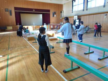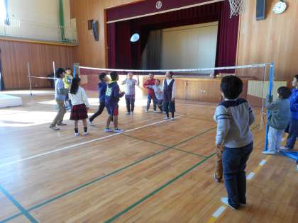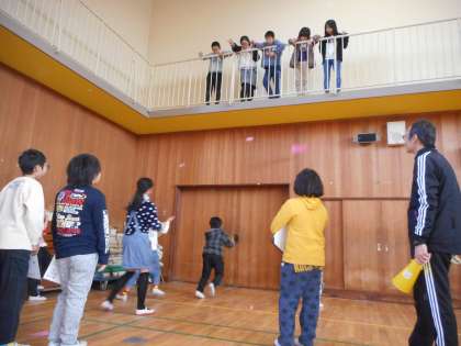 上から、マリオランド・ひらひらペーパー・風船バレーです。講堂でも広さを生かして楽しみました。