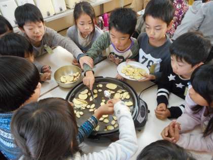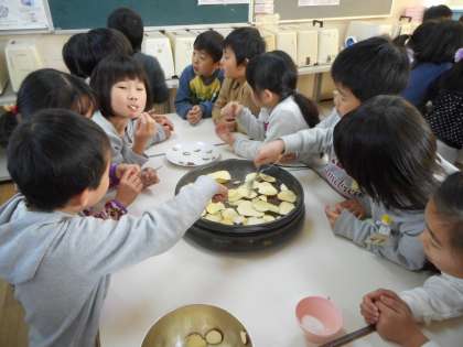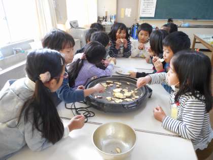 今日2年生はおいもパーティーをしました。最近、学習園で育てていたいもを収穫し、今日はホットプレートで焼いて食べました。甘くておいしかったです。