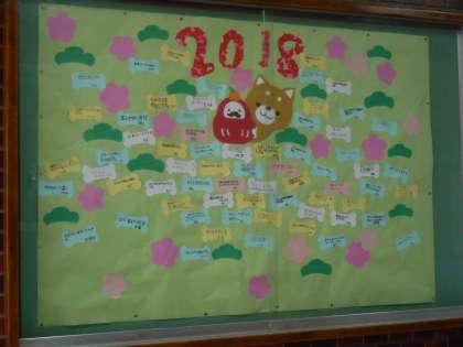 今月の玄関掲示は4年生の作品です。今年の干支の犬を中心に今年の目標を書いています。来校された際は、ぜひご覧ください。