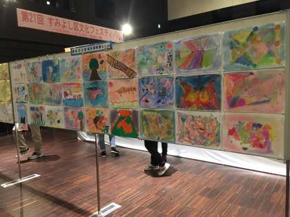先日の土曜日に住吉区民センターで住吉区文化フェスティバルが開催されました。清水丘小学校からはPTA活動の紹介と生涯学習の発表や展示を行いました。生涯学習の展示はお絵かき教室に参加している子どもたちの作品が展示されました。