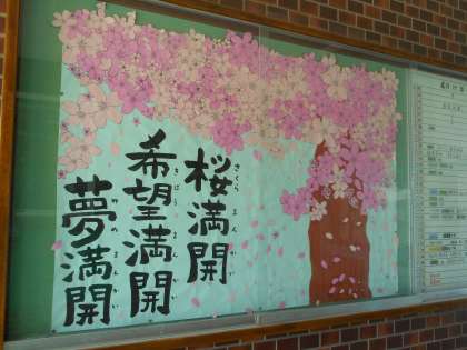 今月の玄関掲示は6年生の作品です。新年度が始まり、気持ちを新たにがんばろうという気持ちが込められています。来校された際には、ぜひご覧ください。