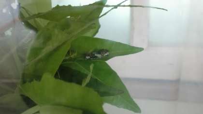 教室の前にあるミカンの木には、アゲハチョウの幼虫がついています。虫かごの中にもたくさんいます。子どもたちは毎日、葉っぱを食べる様子や動きを観察しています。ミカンの木についた幼虫はそのうち、教室のどこかでサナギになることでしょう。そしてきれいなチョウになる日を待ちわびています。