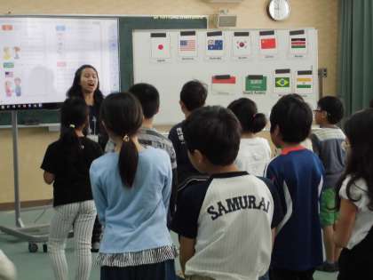 初めまして、ハレン先生ようこそ。一年間どうぞよろしくお願いいたします。4年生になって初めての英語です。子供たちは初めは緊張していて、声も小さかったのですが、ハレン先生のノリノリの授業に引っ張られ楽しく活動ができました。いろいろな国のあいさつや自己紹介などを学習しました