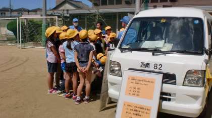 収集車の仕組みを教えていただいて、実際にごみを入れる体験をしました。大きな機械を前にちょっと怖がっている子もいました。ペットボトルで出来ている作業用の服を羽織らせてもらったり、靴や手袋をつけたりしました。「先生、この靴踏んでみて。鉄が入っているねんで。」と興味津々です。