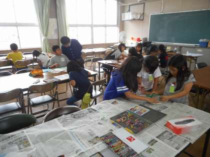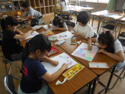 月曜日の放課後に不定期でお絵かき教室が行われています。対象は3年生以下です。生涯学習の方が講師に来ていただいて取り組んでいます。