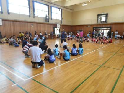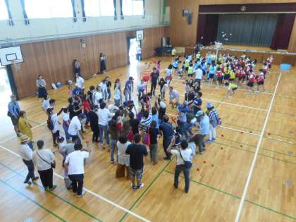 6年生は講堂で親子交流ドッジボールを行いました。親子混合チームで学級対抗の試合をしました。最後には玉入れもしました。楽しく交流できました。