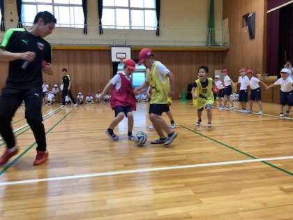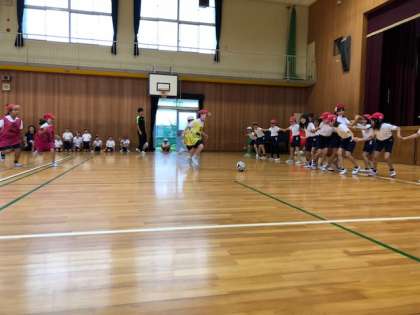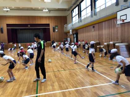 フットサルのシュライカ—大阪の選手・コーチの方が来て下さり、いろいろなボールの運び方や止め方を教えてもらいました。最後にはクラス対抗でゲームもしてとても盛り上がりました!