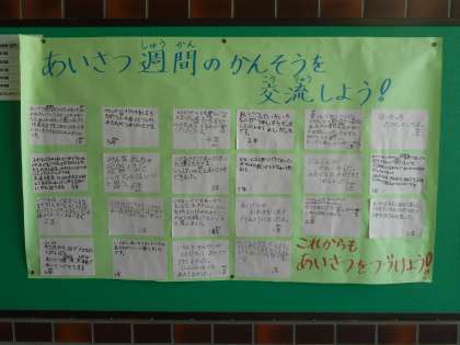 先日、実施したあいさつ週間の各学年の感想文を玄関付近に掲示しています。これからも元気なあいさつを続けて欲しいと思います。