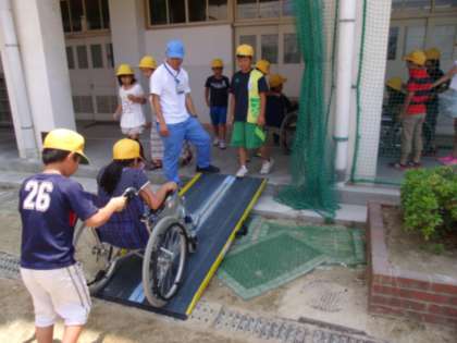 講堂で簡単な扱い方を練習した後、1階の廊下を車いすを押したり、乗せてもらったり、交代でしました。急な坂のところもあって、怖いところもありました。「ぼくたちが怖いんだから、障がいのある人はもっと怖いかもしれないなぁ。」とのつぶやきもありました。車いすを押す子どもたちの真剣な表情がとてもよかったです。