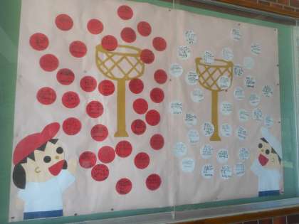 今月の玄関掲示は2年生の作品です。今月末には運動会があります。運動会でがんばりたいことを玉入れで表現しています。来校された際は、ぜひご覧ください。