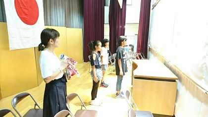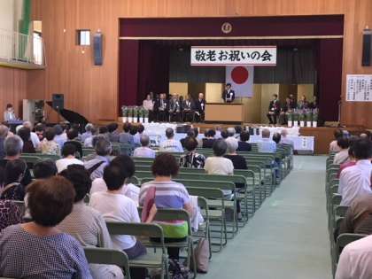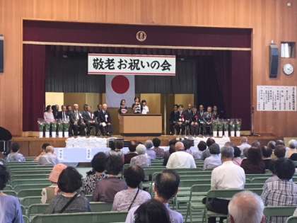 今日は敬老の日のお祝いで敬老記念祝典が行われています。祝典では小学生を代表して6年生の代表児童がお祝いの言葉を伝えました。少し緊張していた様子もありましたが、立派に話していました。